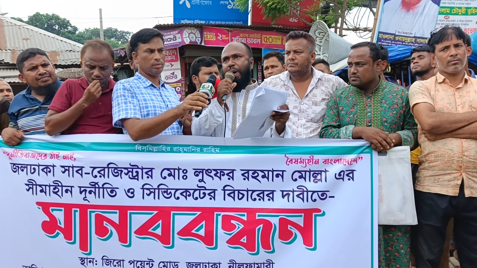 জলঢাকায় সাব-রেজিষ্ট্রার লুৎফর রহমান মোল্লার বিরুদ্ধে মানববন্ধন।