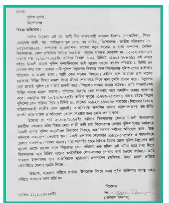 পুলিশের পরিচয়ে কিশোরগঞ্জের এক সাংবাদিককে মোবাইল ফোনে প্রাণনাশের হুমকি দেওয়ার অভিযোগ উঠেছে। এ ঘটনায় বুধবার (২২ অক্টোবর ২০২৫) দুপুরে কিশোরগঞ্জের
