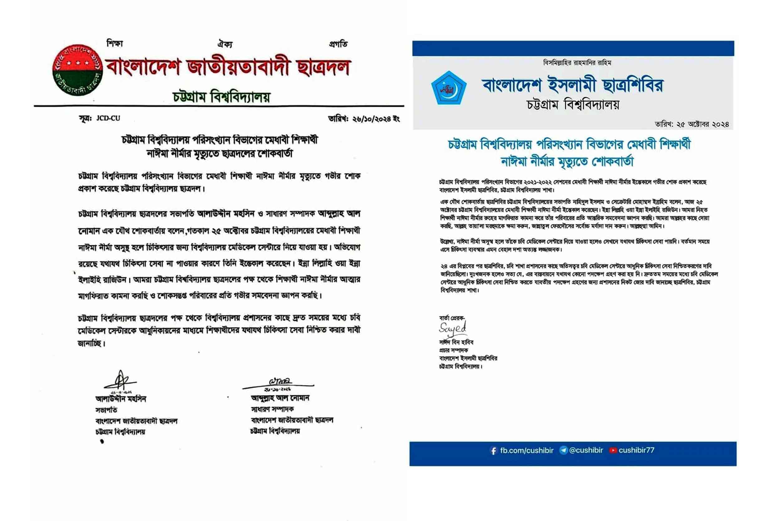 চবি শিক্ষার্থী নাঈমার মৃত্যুতে ছাত্রদল-ছাত্রশিবিরের পৃথক শোক বার্তা